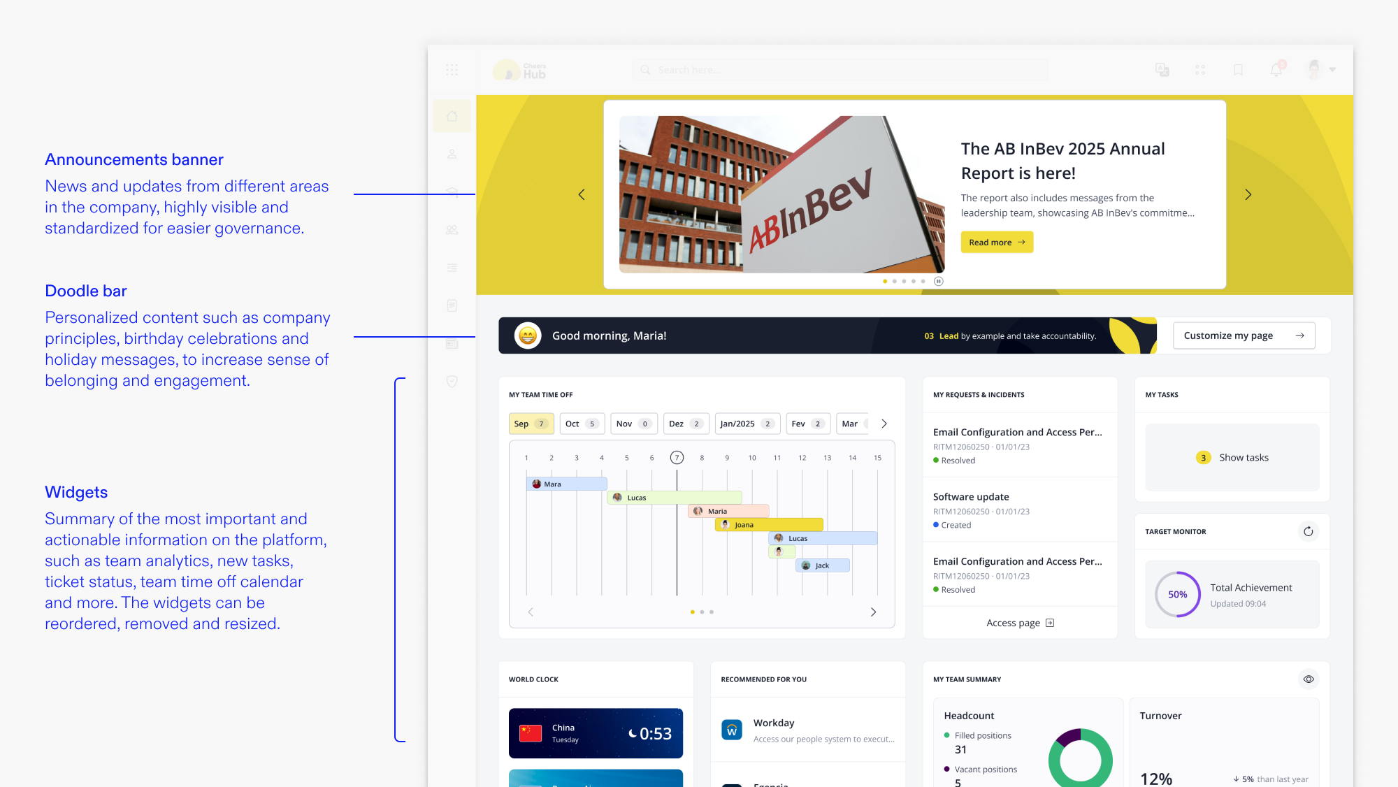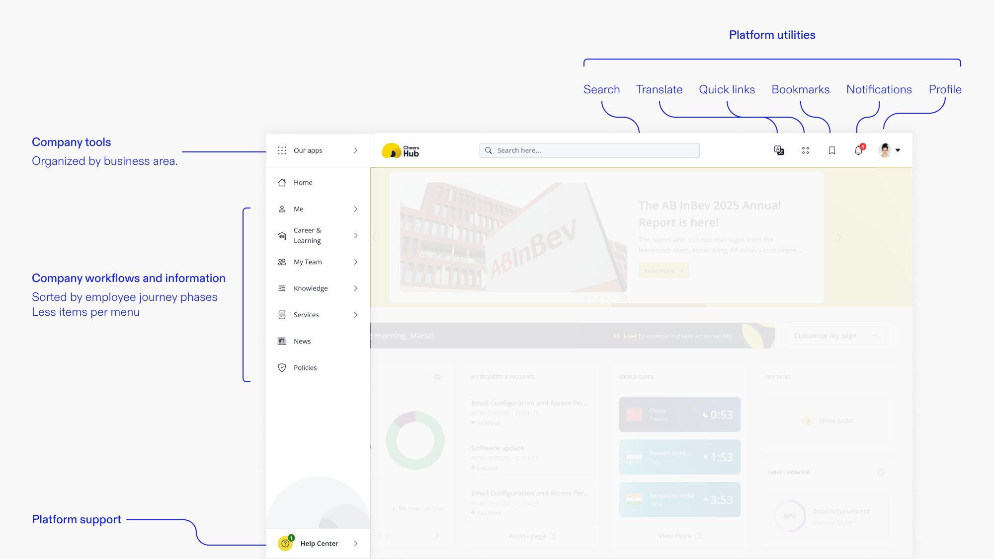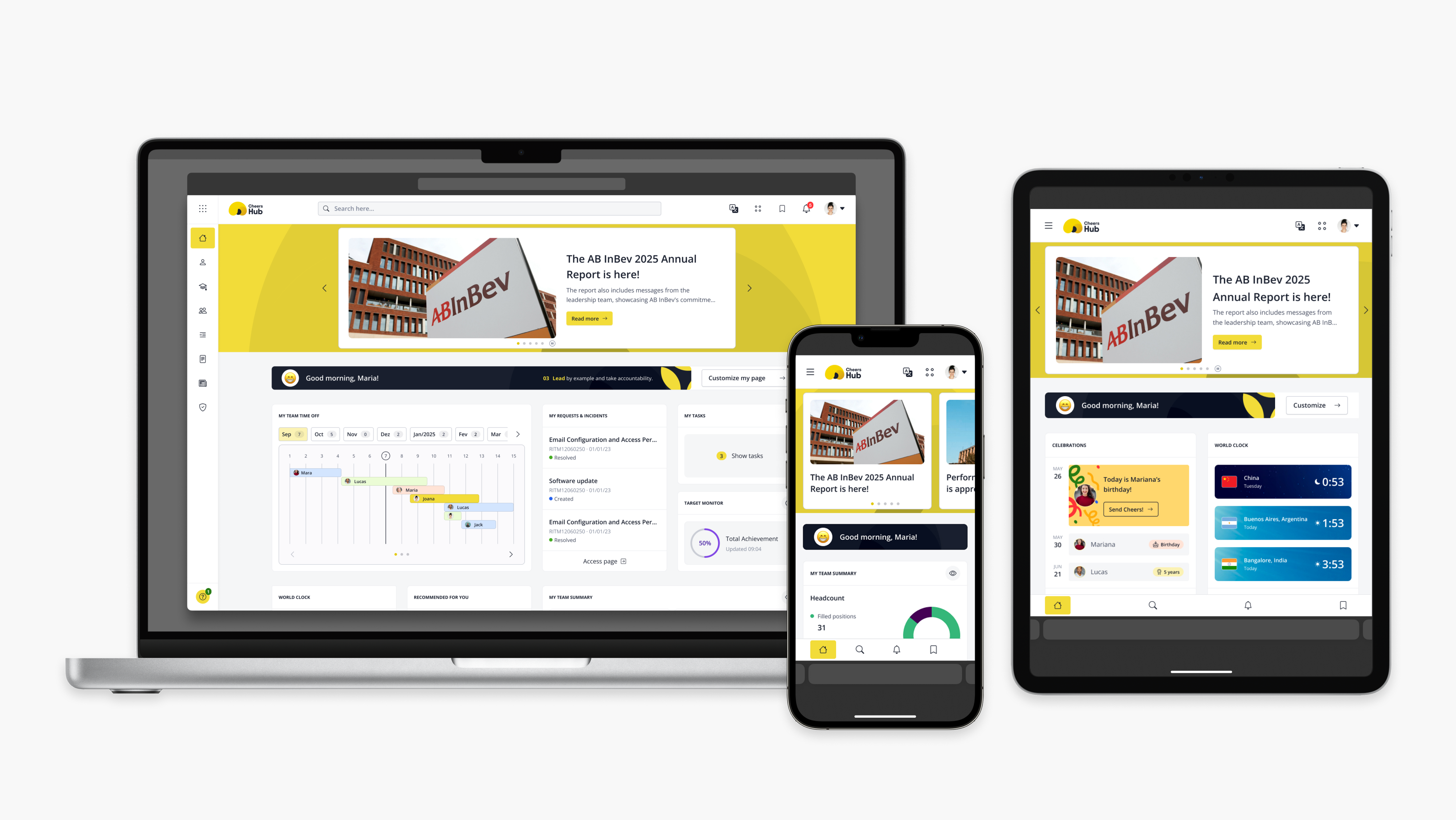 - Embed AB-InBev’s evolving AI Assistant and GenAI into Cheers Hub to help employees find information instantly, complete processes seamlessly, and unlock actionable insights, while automating routine tasks, improving engagement, and freeing teams to focus on higher-value work.
