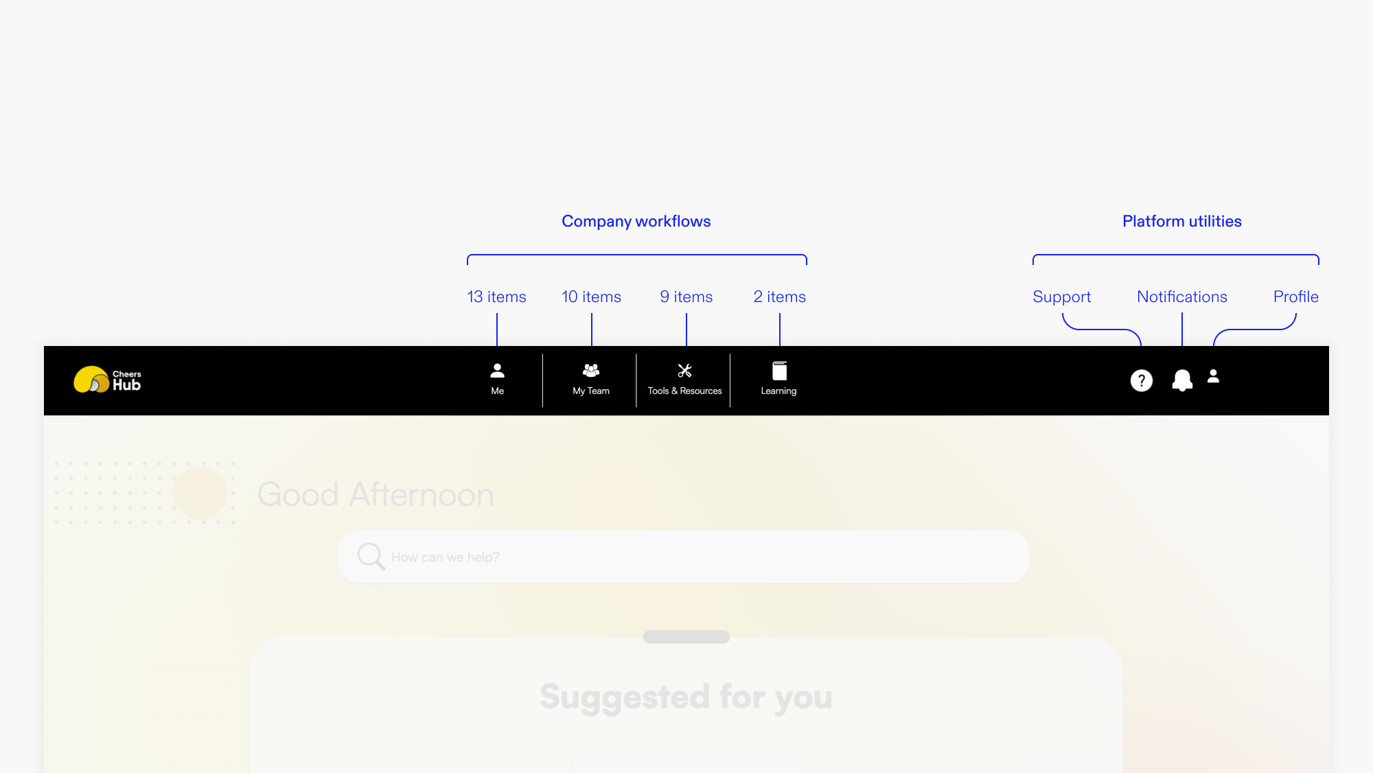 In partnership with People and Tech teams, we defined a new UX strategy, value proposition, and strategic pillars. This strategy guided roadmap decisions and positioned Cheers Hub to evolve into a one-stop-shop for tasks, knowledge, collaboration, and growth, balancing employee needs with business goals.