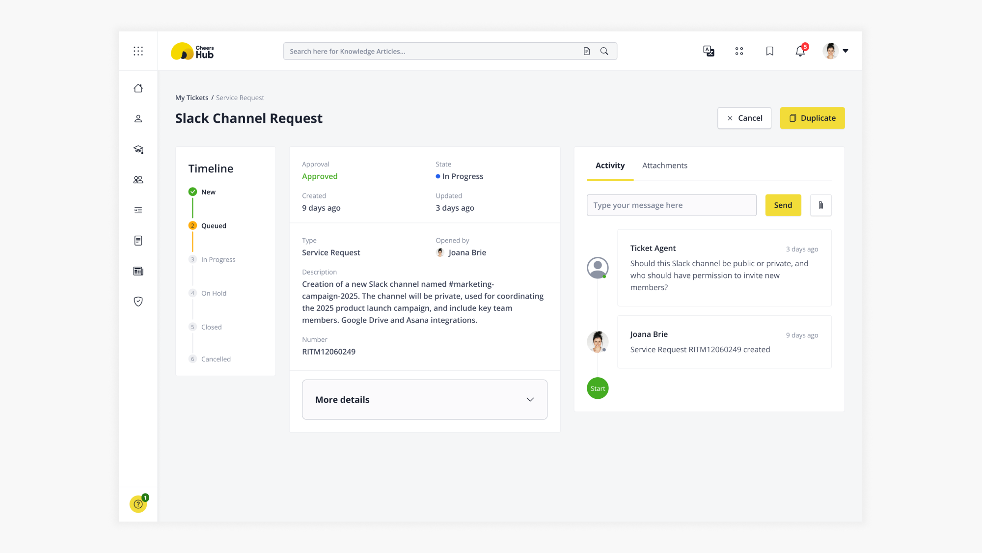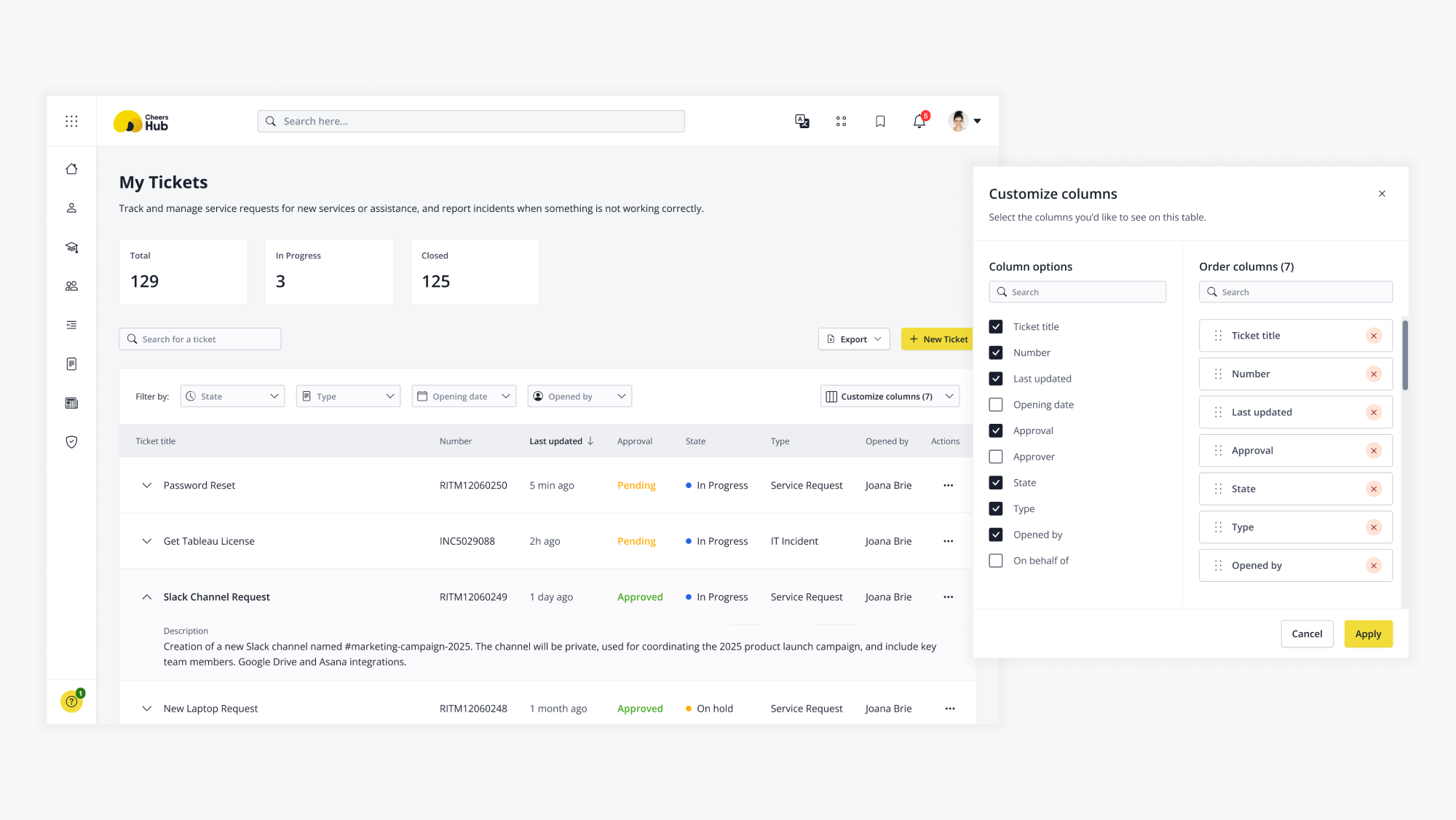 - Simplified details: Ticket detail pages show only the most essential information by default, with the option to expand a section for deeper context.