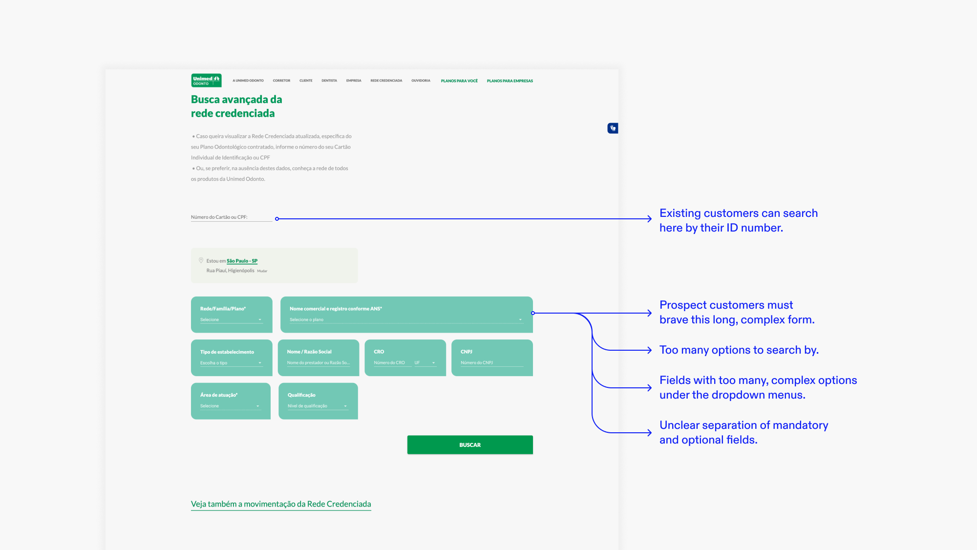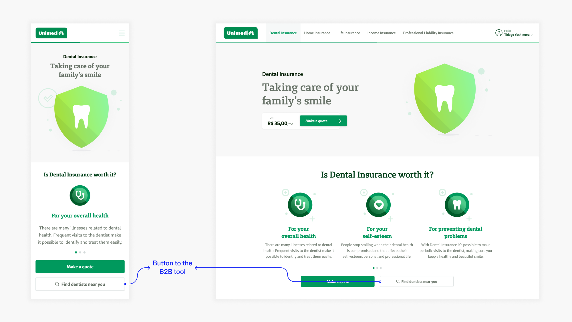 As a temporary solution, I recommended adding a button on the product page to the already existing dentist search tool found on the company’s B2B website, which is focused on door-to-door insurance sellers. It was an opportunity to confirm the hypothesis that the dentist network was an important purchase factor for clients and to also justify the research, design, test, and development of a brand new, tailor-made dentist search tool for the Unimed Corretora website which followed soon after.