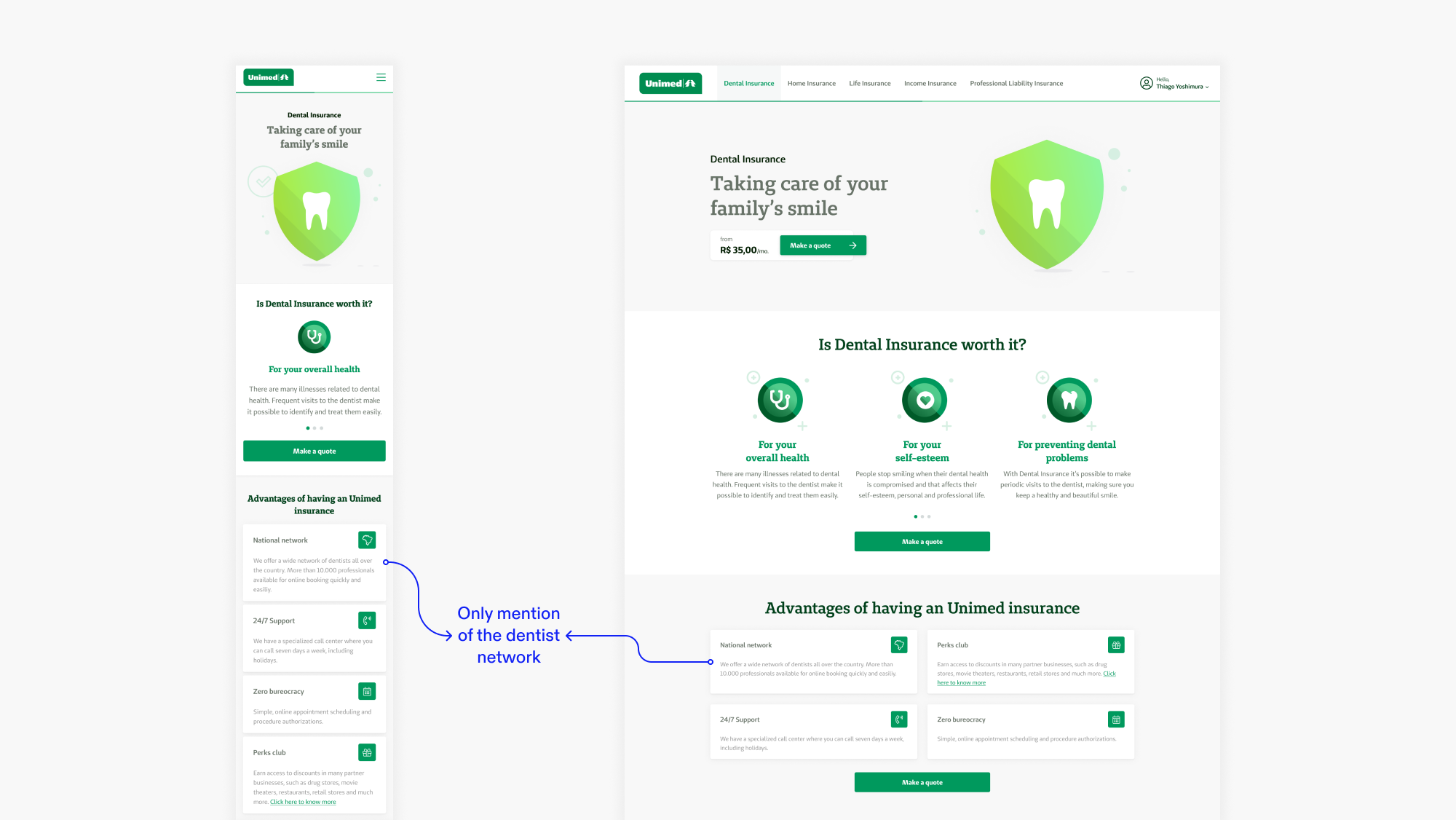 Unimed Corretora de Seguros is the web-based, B2C insurance e-commerce of Unimed, the world’s biggest health cooperative. It offers a wide range of products, including dental insurance, which is the focus of this case study. As part of a team of three designers, we worked full time with the client to launch new products for online purchase, along with continuous improvement of the overall platform.