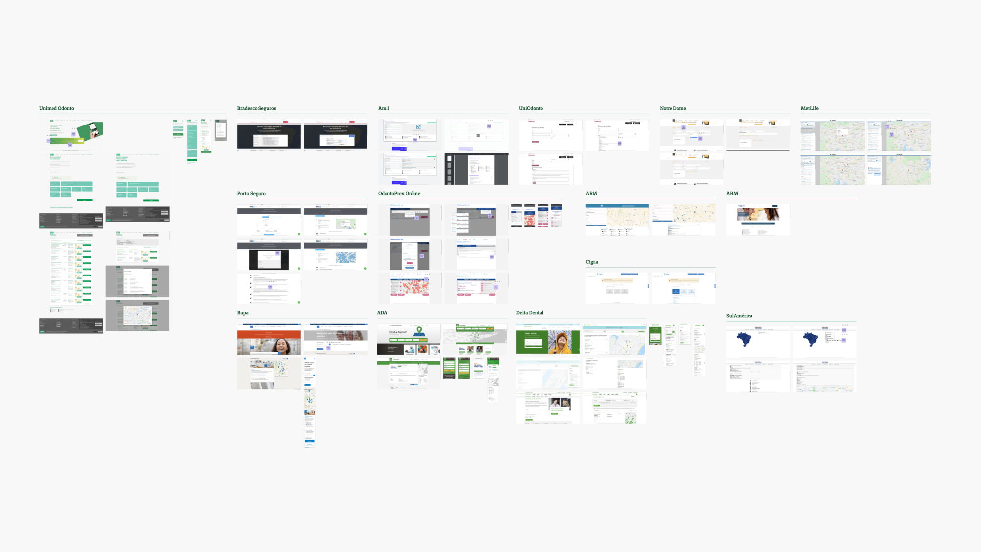 The first step was to analyze the B2B tool to understand how it worked, its navigation flow, and available information to properly consume the dentist data through its API. I also observed its usability issues to not repeat the same mistakes and find improvement opportunities.Later, I broadened the scope and analyzed similar search tools from other insurance providers, dental and medical, from Brazil and other countries, in search of best practices and inspiration to create an efficient and familiar tool.