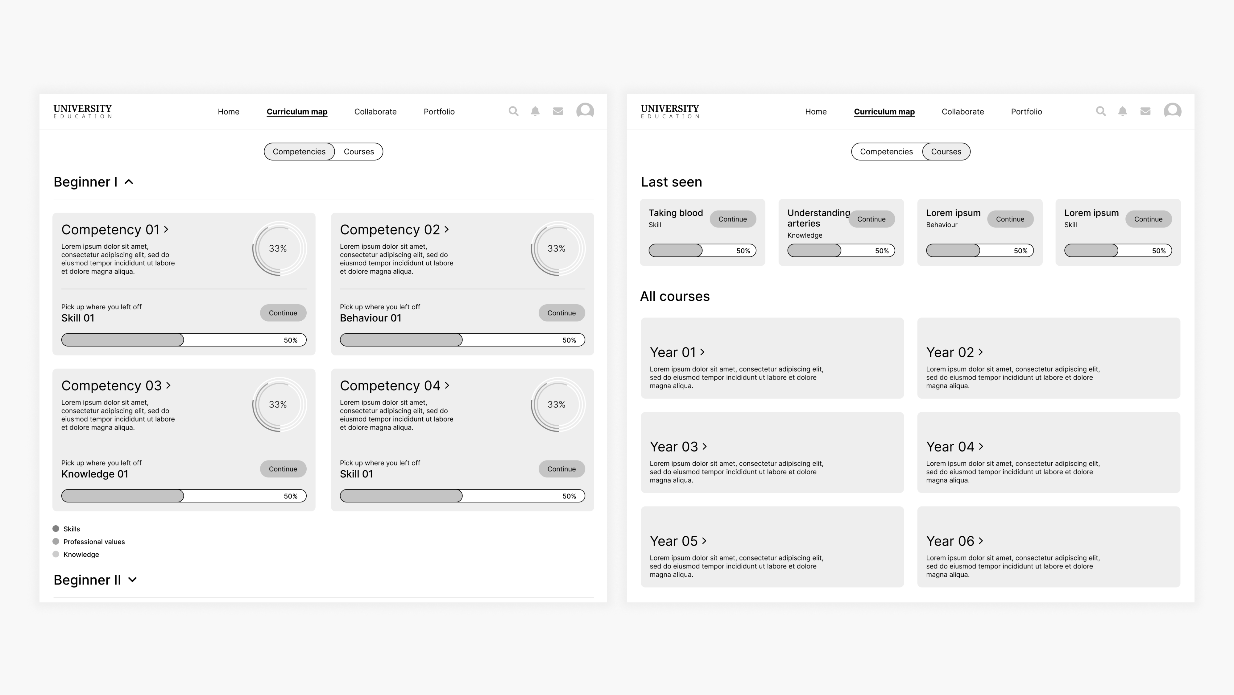 During our weekly cocreative sessions, we experimented on many different approaches to view and navigate the curriculum map. The traditional way is to go from one module to the next. We wanted to offer an alternative, where the student could focus on the competencies behind each module instead.For example, instead of taking the Endocrinology 1 module, the student could focus on mastering the “Obtain a capillary blood glucose reading” competency, which will be made up of activities from that module but also others.