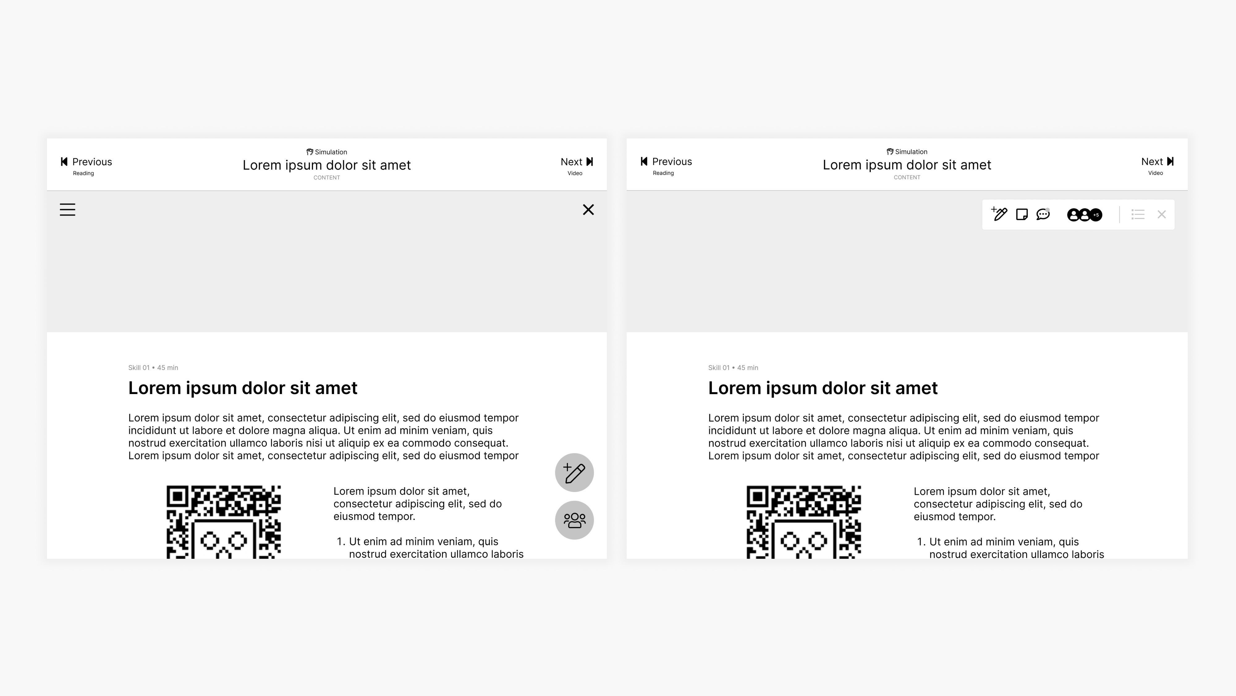 Wireframe of the content page with the collaborate toolbar - different iterations.