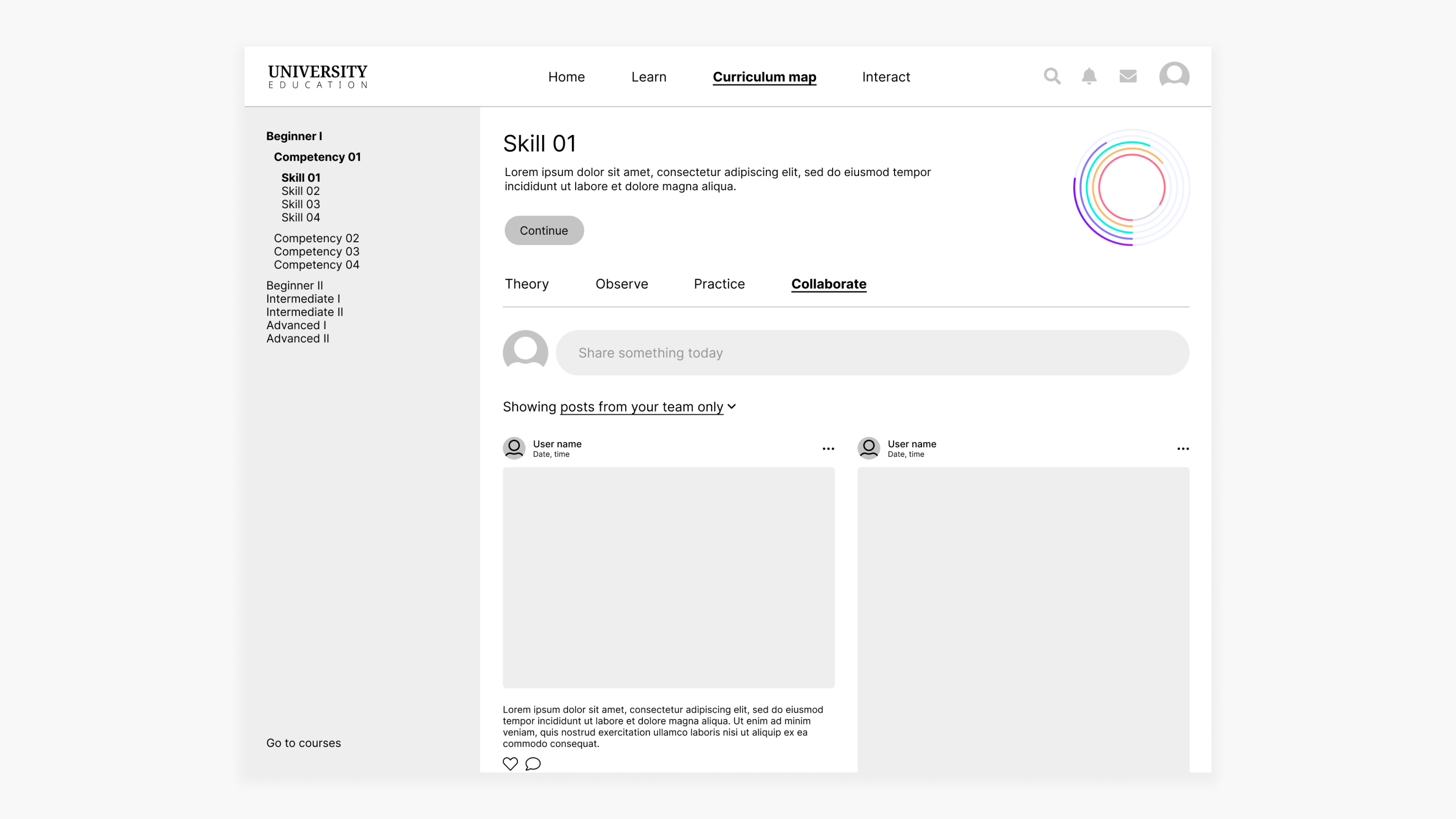 Since this will be a mostly online course, it’s very important that the platform give students opportunities to create bonds and collaborate with each other.Taking a page from the book of current e-learning tools, my first approach was to add a social feed to each module page. The idea was that the students could have discussions on the same place they could read theory, observe and practice that particular topic.