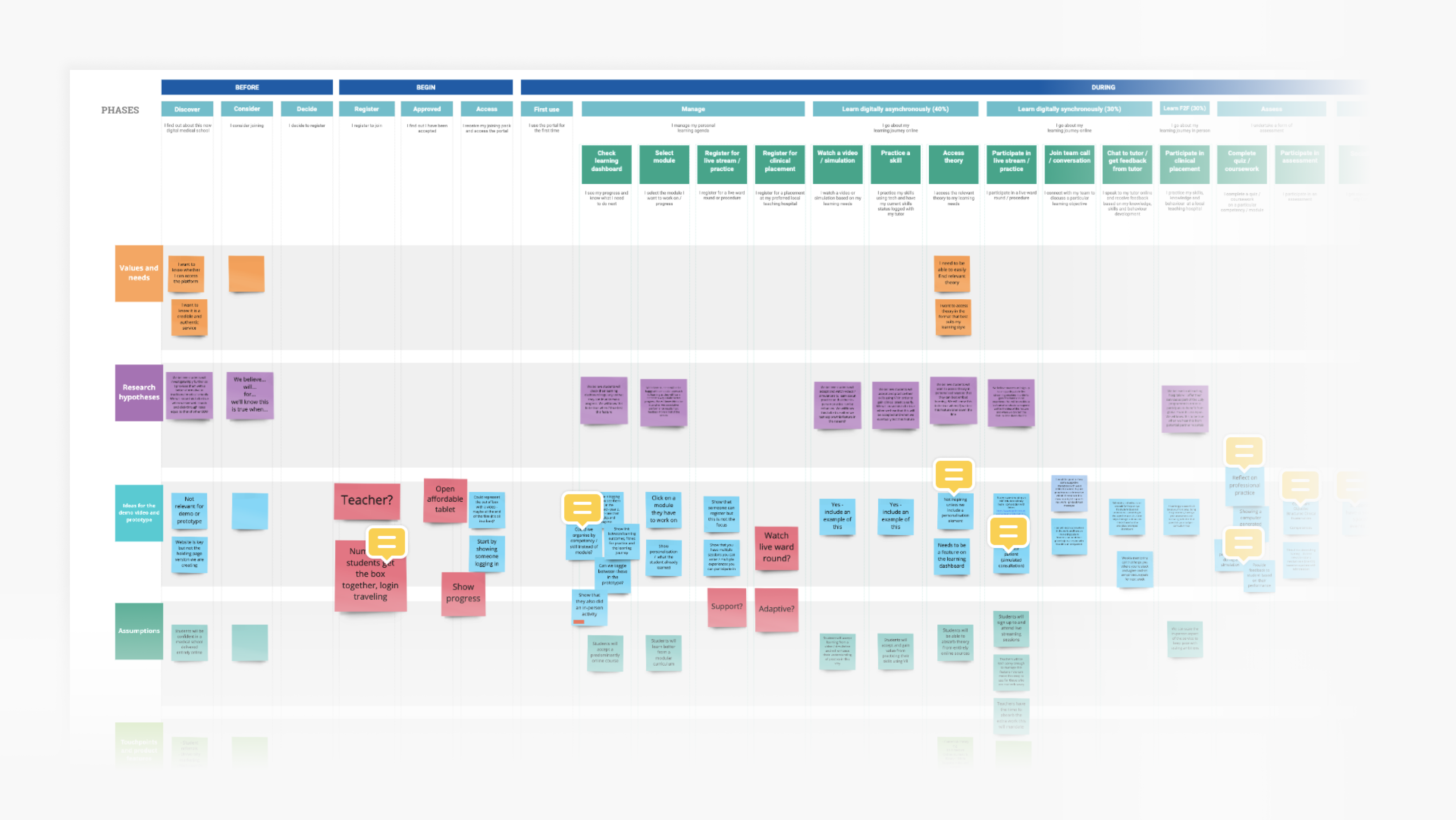 - Medical student journey mapping workshop: mapping out phases, activities, values, needs, hypothesis, product touchpoints and other insights from the student journey.