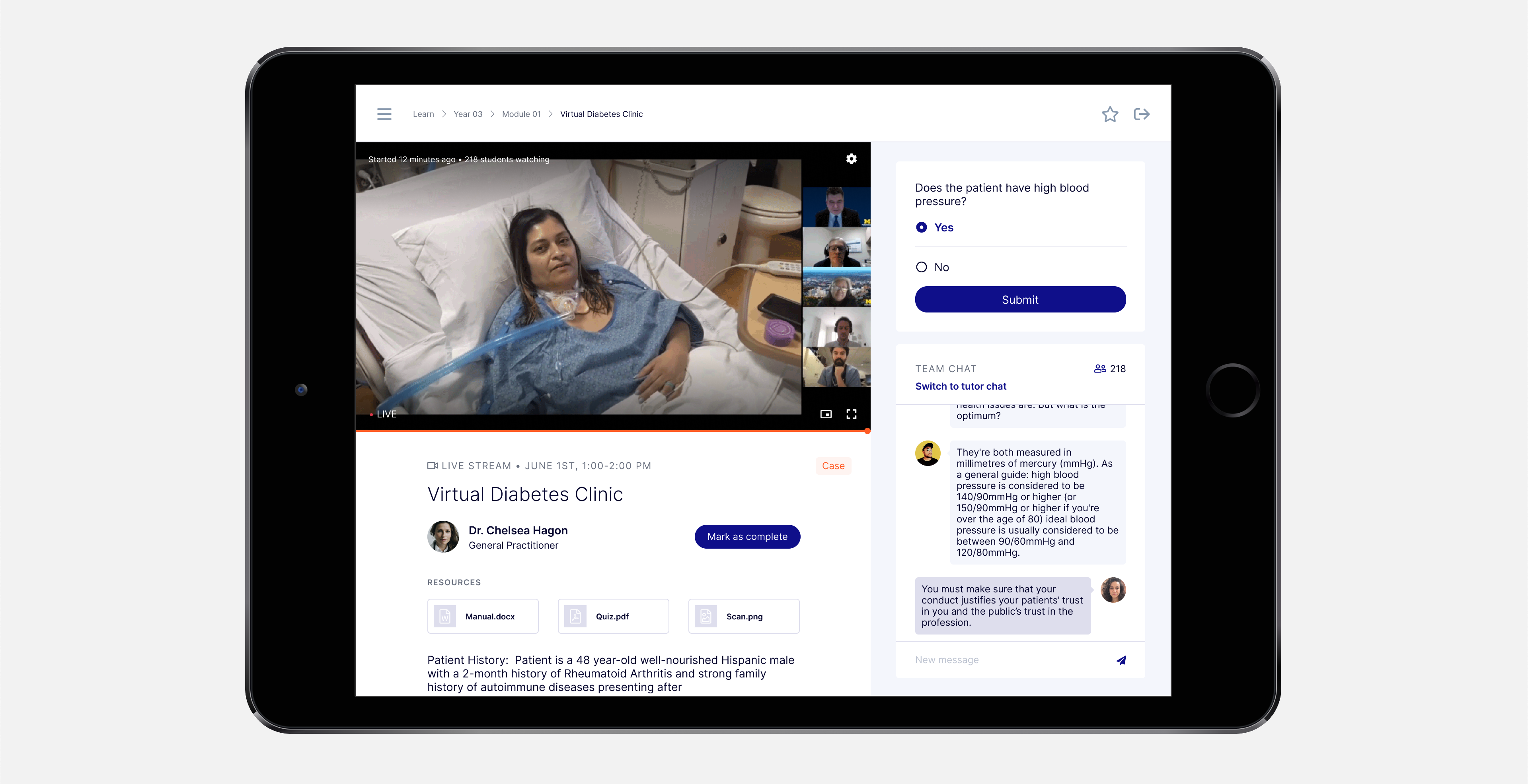 Live stream: a teacher broadcasts live a real ward round. Here the students can read about the case, answer quizzes and chat live amongst themselves and with the teacher.