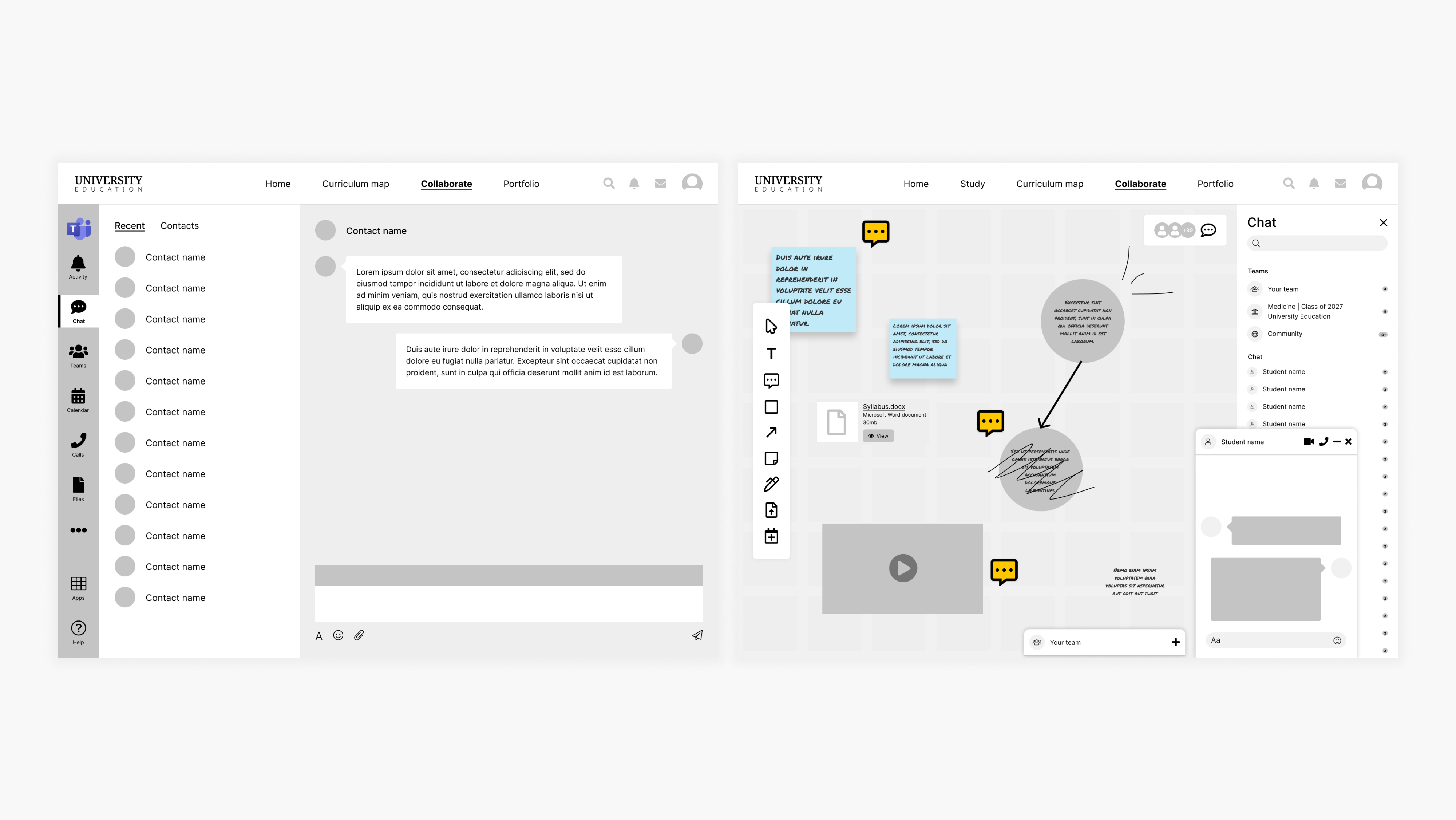 During the following iteration rounds, a chat feature was added to help students communicate amongst each other and inside groups. Those chats can also turn into whiteboards for freehand collaboration, where they can add post-its, images, videos, drawings and more.